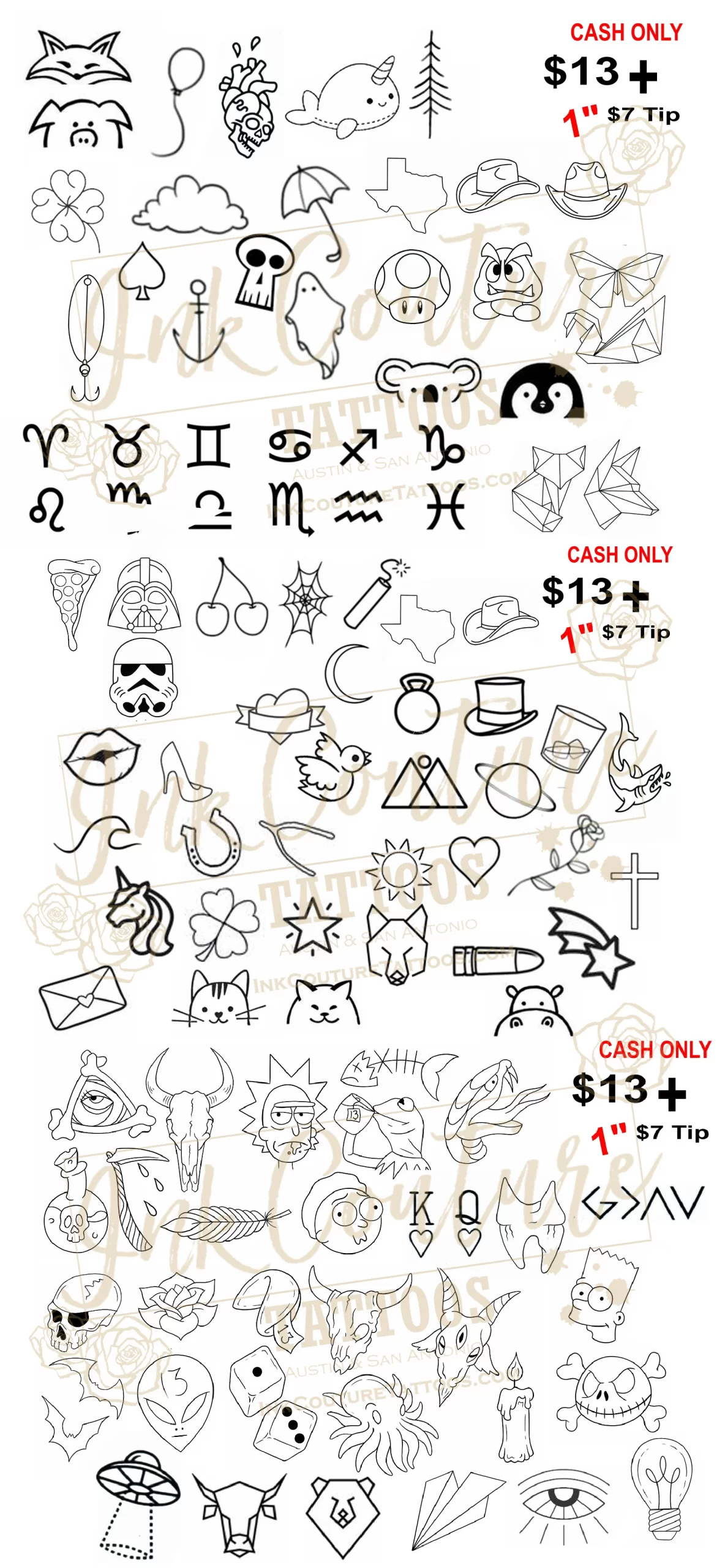 $13 Tattoos + $7 Tip (1-inch designs)