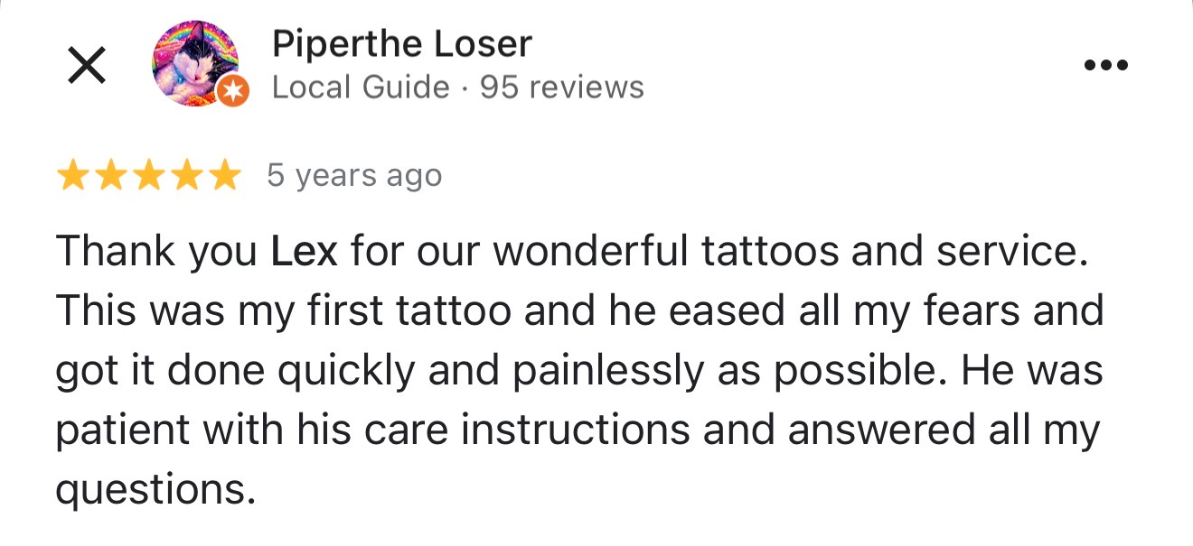 I have 20 years experience in many forms of tattooing and will create custom pieces that no one will have on their body except you that’s getting the specific piece.